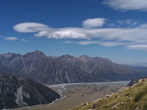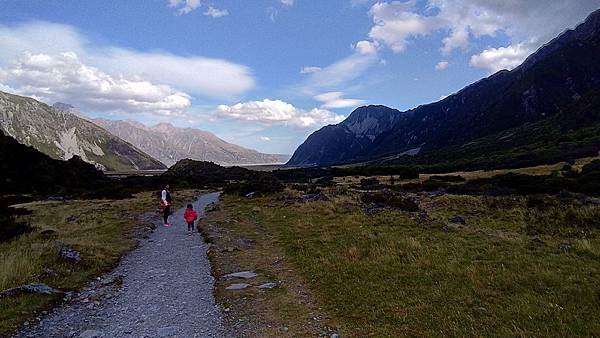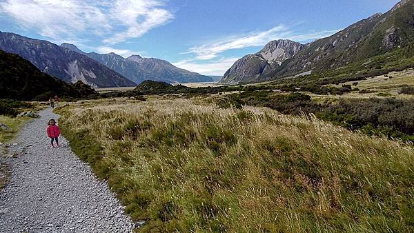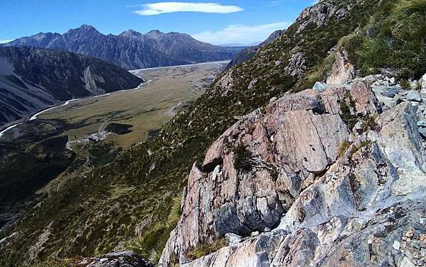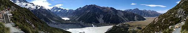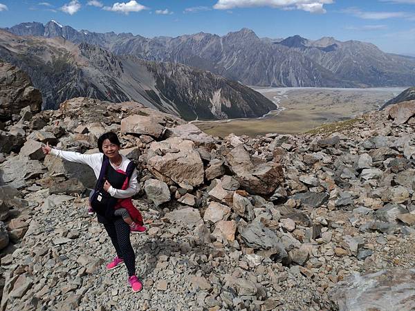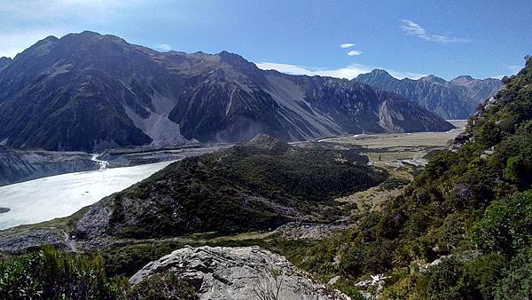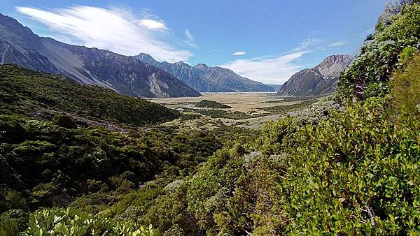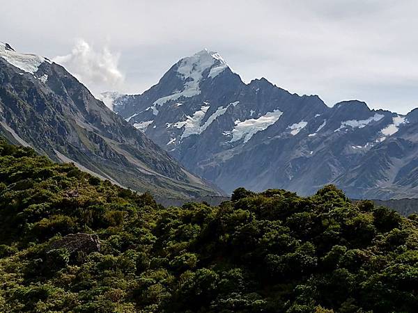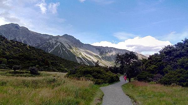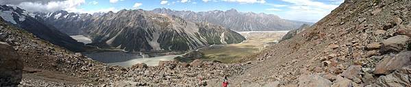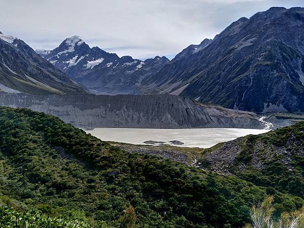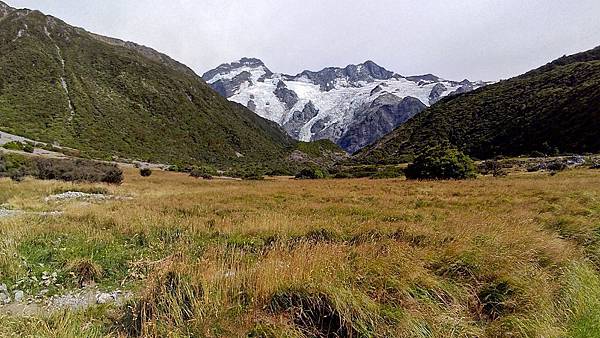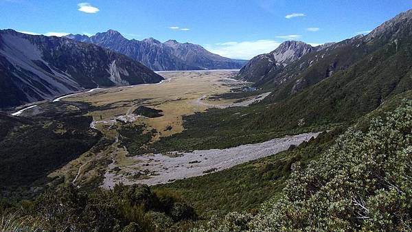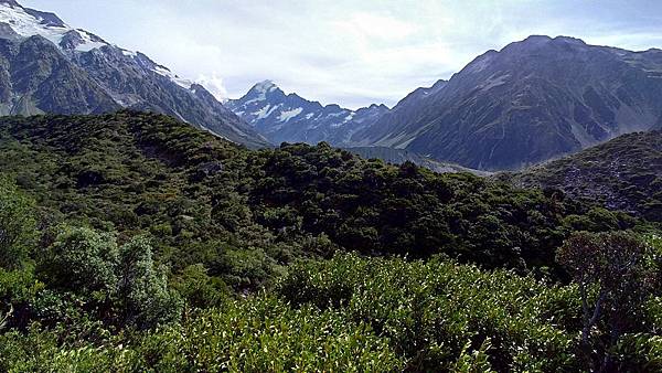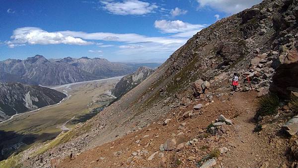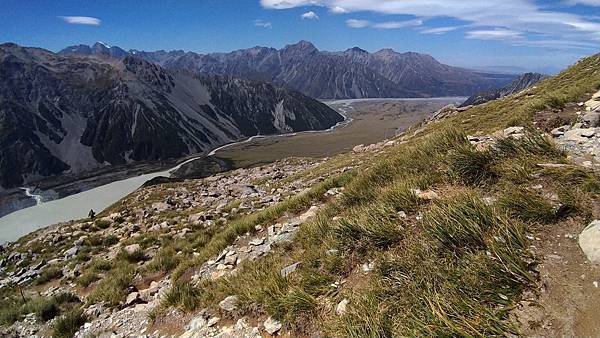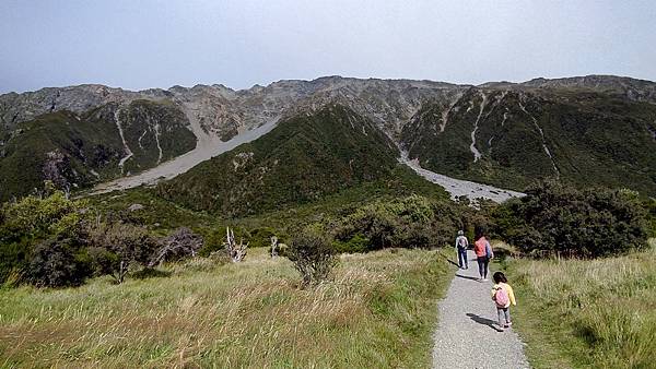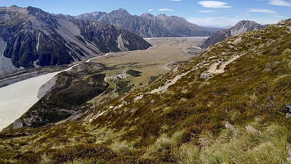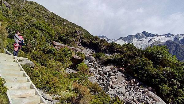 從正前方雪山前的山凹處穿出,是另一條步道 Kea Point 的終點處,我們今天則是要從左邊的山坡陡上 。