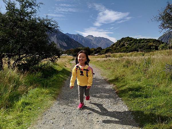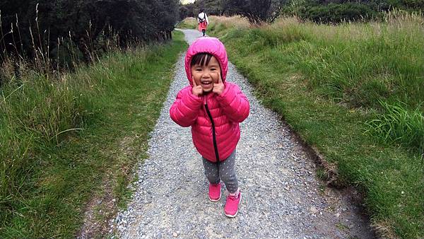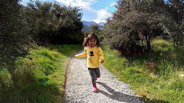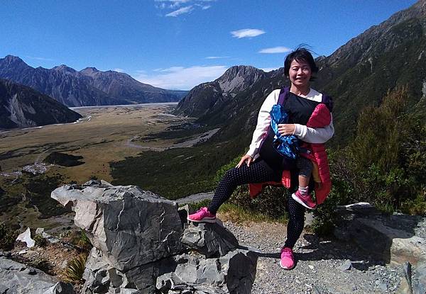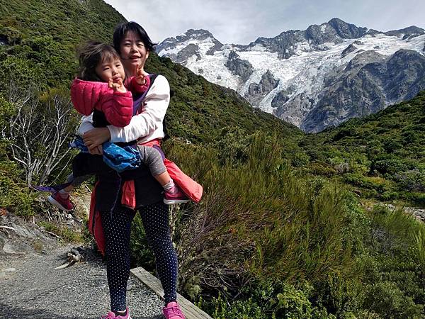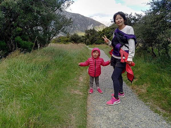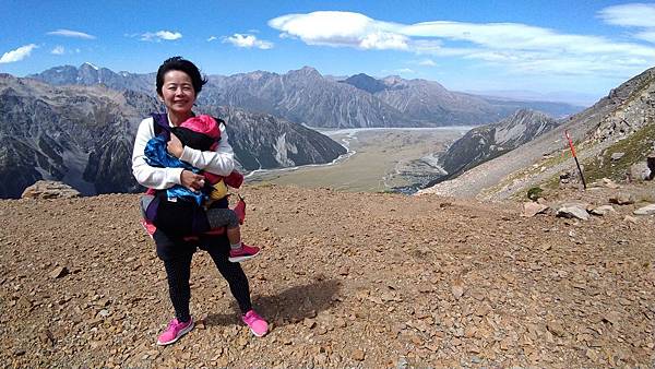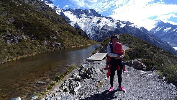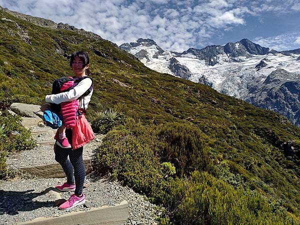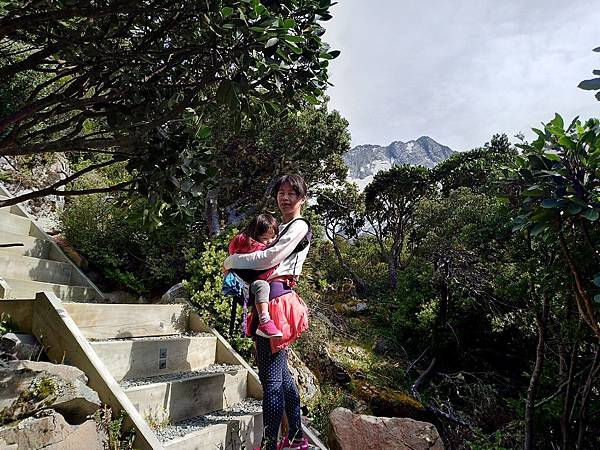 過了叉路口,來到 Sealy Tarns Track,我們沒有走過的路線,而且要開始爬陡坡了,為了爭取時間,要讓芮上背帶,芮還想繼續自己走耶