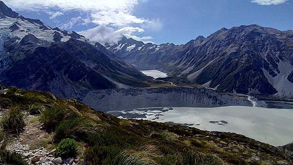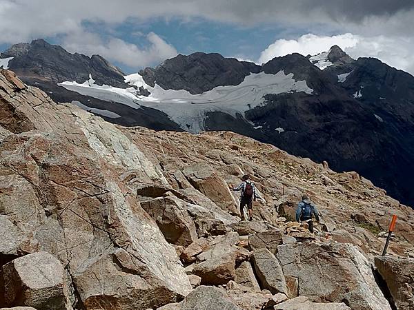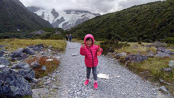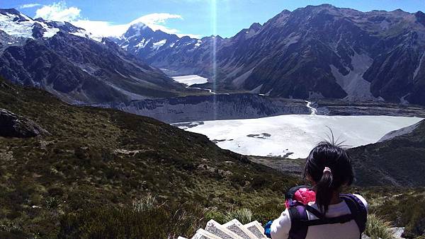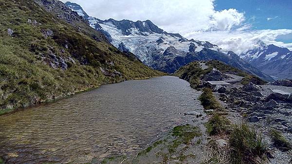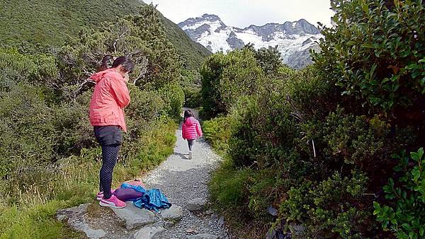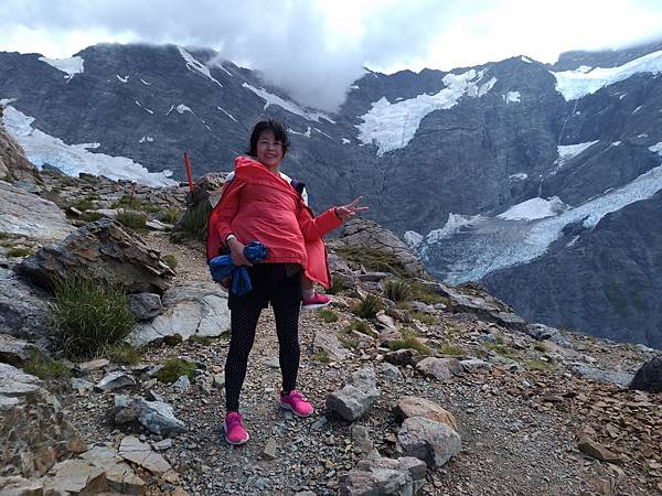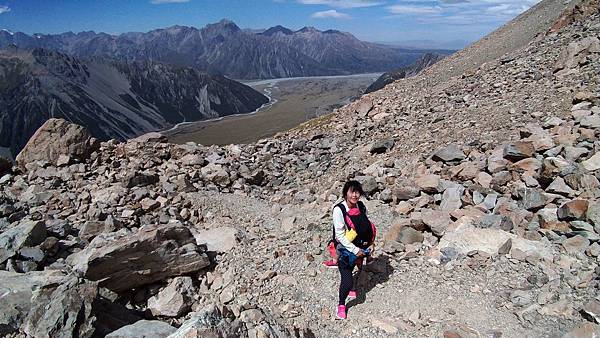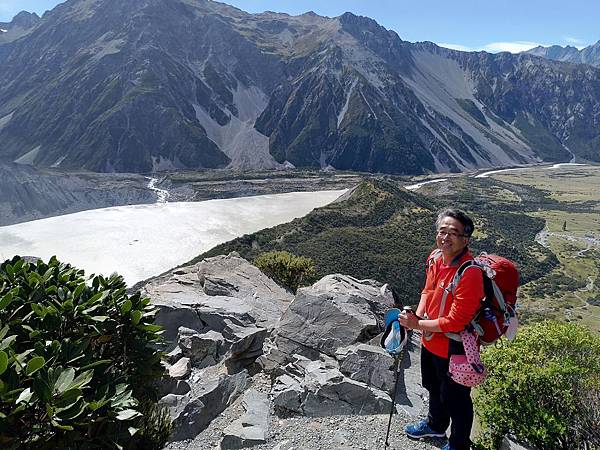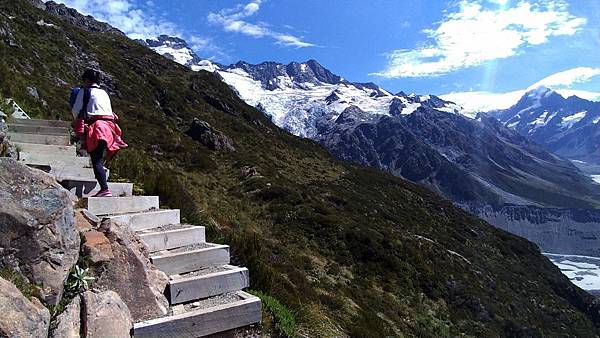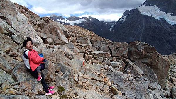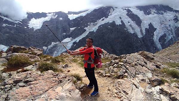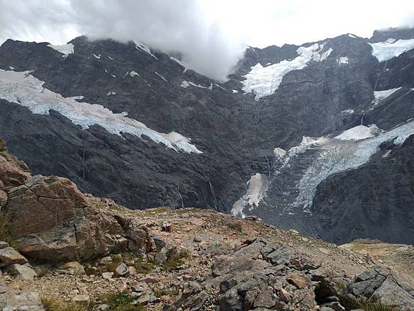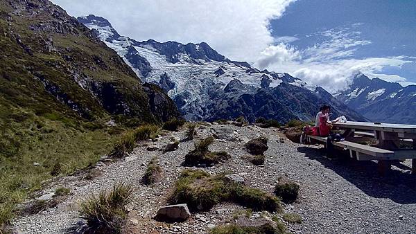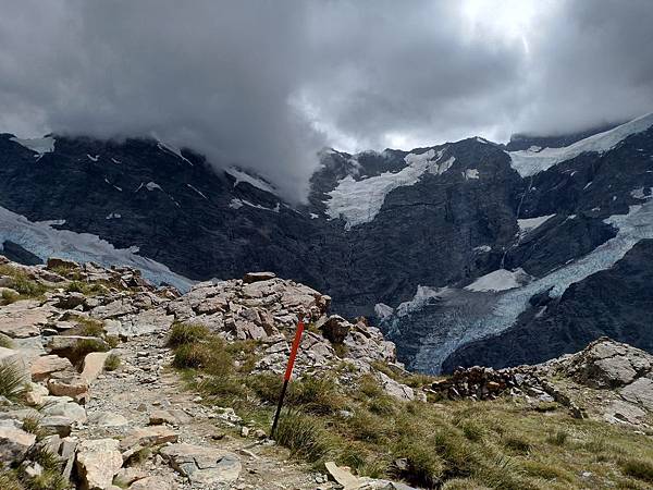 看起來,前面的冰河也很壯觀,只是遠處天空烏雲密布,擔心下雨及回程時間不夠,就不繼續走向 Mueller Hut。