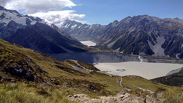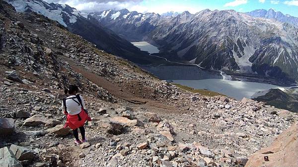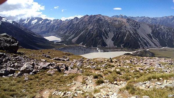 從 Sealy Tarns Lookout 俯視 Sealy Tarns ,右上方則是往 Mueller Hut 陡上的步道